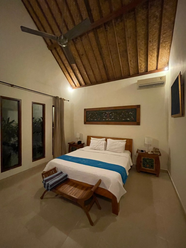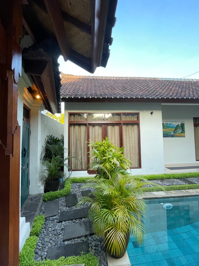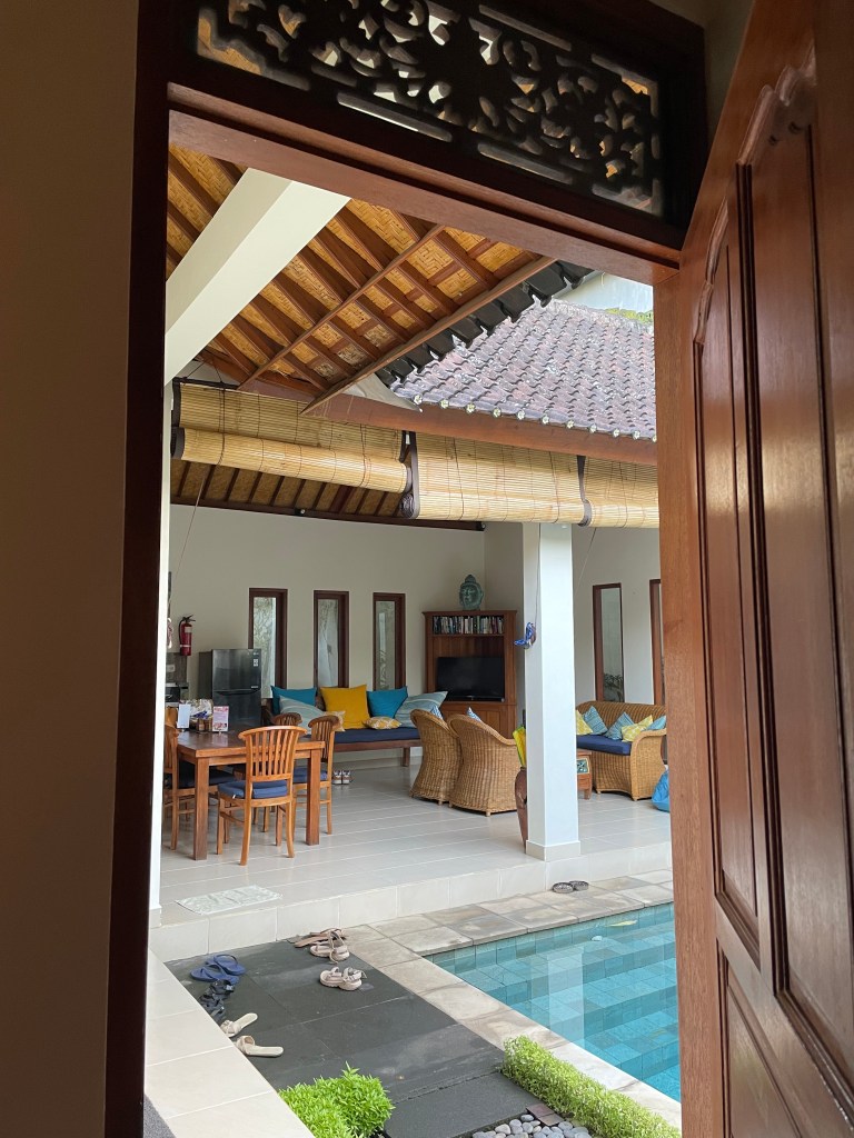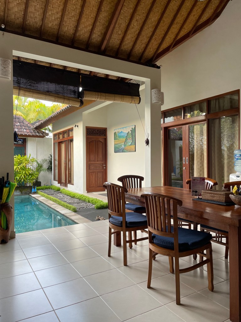When my family travelled to Ubud for the Songkran holidays, we chose a villa located in one of the small streets near the monkey forest. The villa is independently managed with three bedrooms and a good-sized swimming pool, a full kitchen and lovely dining and living room outdoors. The name of the villa is Villa Mewali.