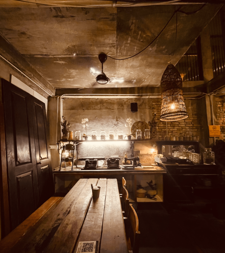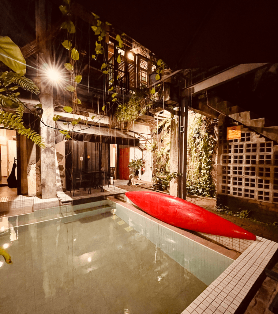 Indeed, there is a pool inside, and even a kayak that one guy was riding on when we arrived. There is a bicycle that’s suspended on one of its walls, and old typewriters, a sewing machine, and ice-grinder decorating one of the desks near a coffee table.